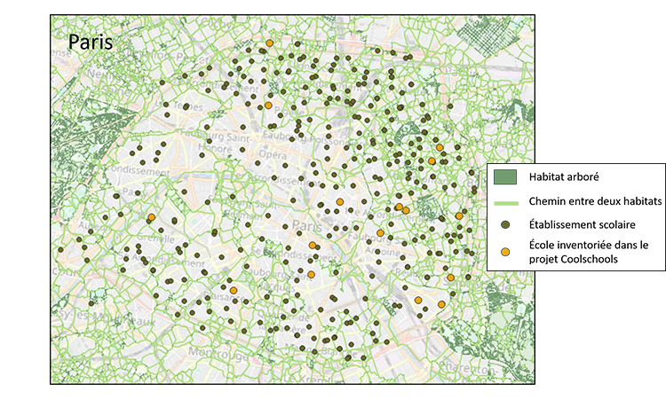 Grâce à leur répartition régulière dans l’espace urbain, les cours d’école pourraient jouer un rôle de “stepping-stone”, c’est-à-dire de petits habitats intermédiaires suffisamment nombreux pour constituer des corridors discontinus entre des habitats plus grands (parcs et jardins par exemple).
